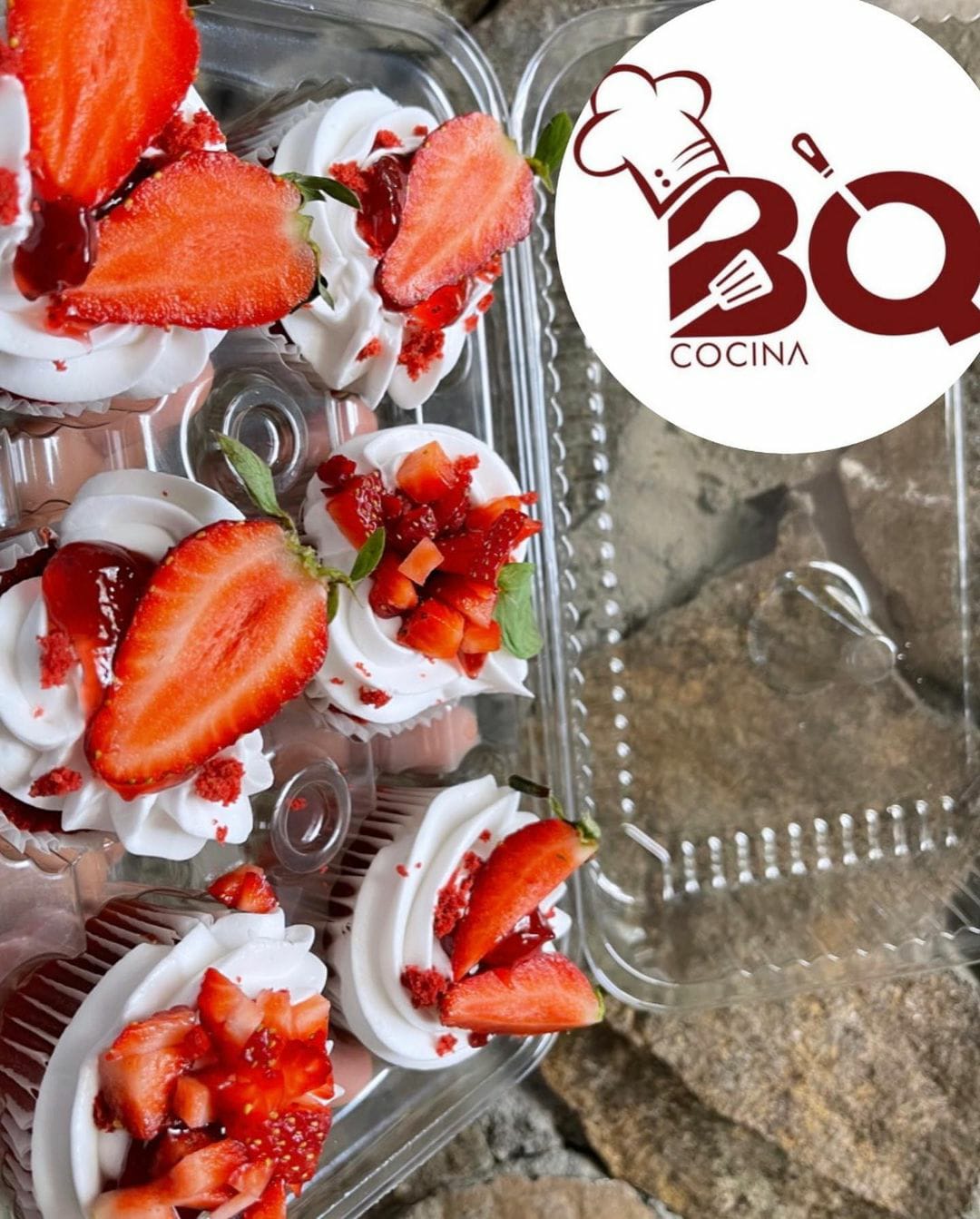 Cupcakes de chocolate, rellenos con coco rallado. Crema chantillí, fresa y caramelo de fresa